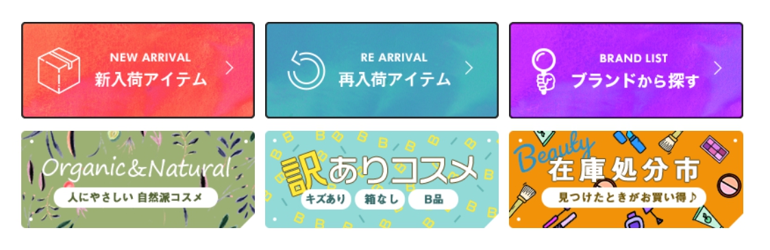 | スキンケア | 国内外の人気ブランドが勢揃い。美容液やクリームなど高単価なアイテムほどお得感があります。 |