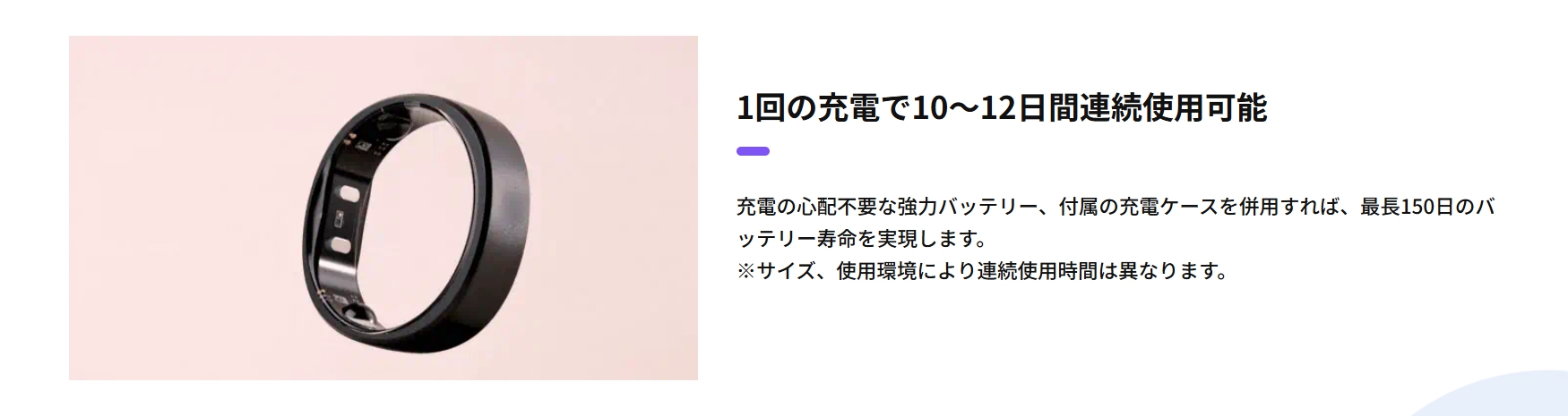 リング本体だけで約7日間の連続使用が可能です。さらに、イヤホンのように「充電機能付き専用ケース」が付属しており、これと組み合わせることで最大150日間、コンセントのない環境でも使い続けることができます。出張や旅行が多い方でも、充電切れを心配する必要がほとんどありません。