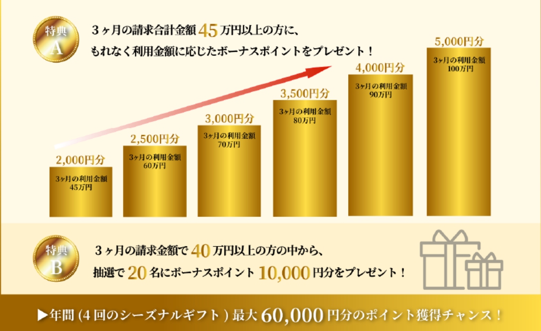 | ボーナスポイント | 年間の利用金額に応じて、さらにボーナスポイントが付与される仕組みがあります。 |