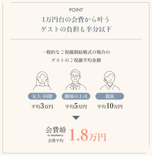 会費婚とは、その名の通り「ご祝儀」ではなく、一律の「会費」でゲストを招待するスタイルです。anymarry.では、さらに一歩進んだ安心を提供しています。