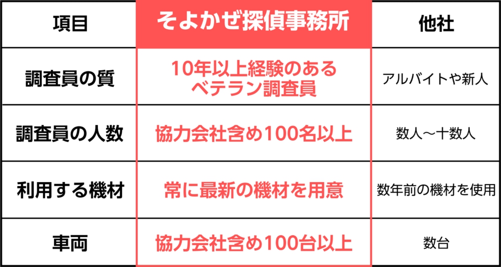 ターゲットに気づかれてしまっては、真実が闇に葬られるだけでなく、関係がさらに悪化してしまいます。そよかぜの調査員は、厳しい訓練を積んだ尾行と張り込みのスペシャリスト。周囲の環境に溶け込み、相手に一切の不信感を与えることなく、静かに、確実に真実を追います。